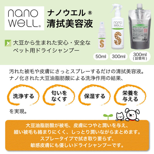 ナノウエル 清拭美容液 300ml つめかえ用 ペット 犬 猫 お手入れ シャンプー 洗浄 消臭 毛艶 皮膚 被毛 ケア ドライシャンプー イヌ ネコ 詰替 日本製