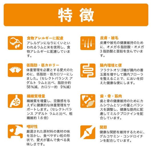 セレクトバランス スリム 成犬の体重管理用 ラム 小粒 3kg 犬 ドッグフード 犬用 フード ドライ 成犬用 ダイエット アダルト 肥満 低カロリー 低脂肪 アレルギー