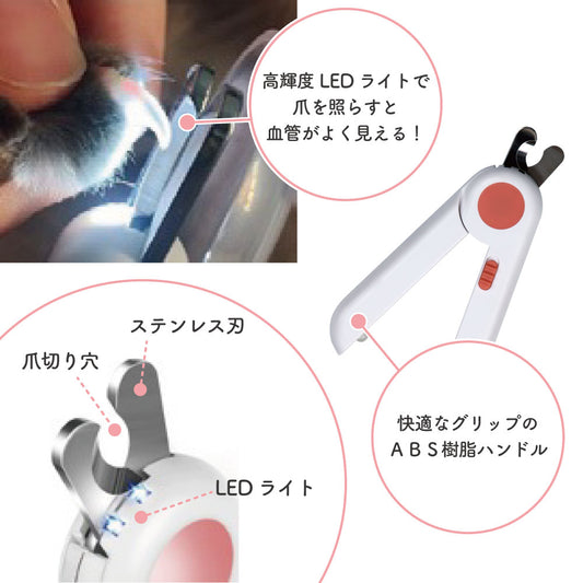 ペット用 LEDネイルクリッパー ペット 犬 猫 小動物 お手入れ ネイルケア 爪切り 光る ヤスリ付 つめ切り グルーミング トリマー