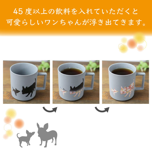 丸モ高木陶器 温感マグ 親子チワワ マットライトグレー 犬 犬柄 マグカップ マグ 犬モチーフ 陶器 イヌ 食器 温度で変化 色が変わる 犬グッズ 日本製