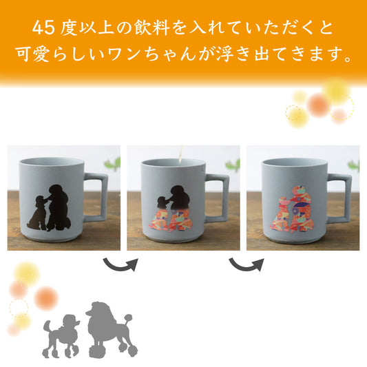 丸モ高木陶器 温感マグ 親子プードル マットライトグレー 犬 犬柄 マグカップ マグ 犬モチーフ 陶器 イヌ 食器 温度で変化 色が変わる 犬グッズ 日本製