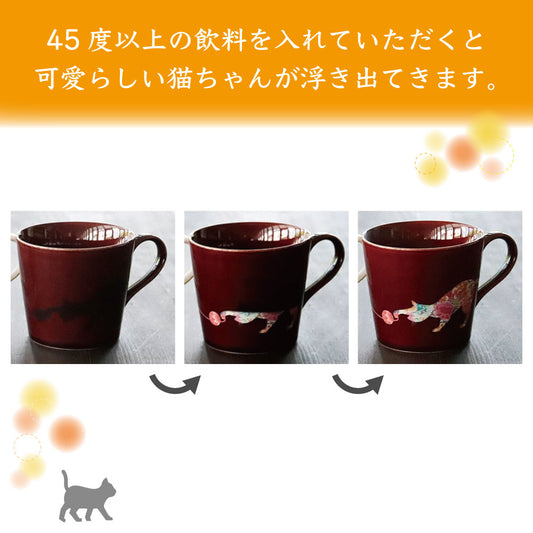 丸モ高木陶器 温感マグカップ 毬と猫 アメ釉薬 猫 猫柄 マグカップ マグ 猫モチーフ 陶器 ネコ 食器 雑貨 温度で変化 温感グレーズ 色が変わる 猫グッズ 日本製