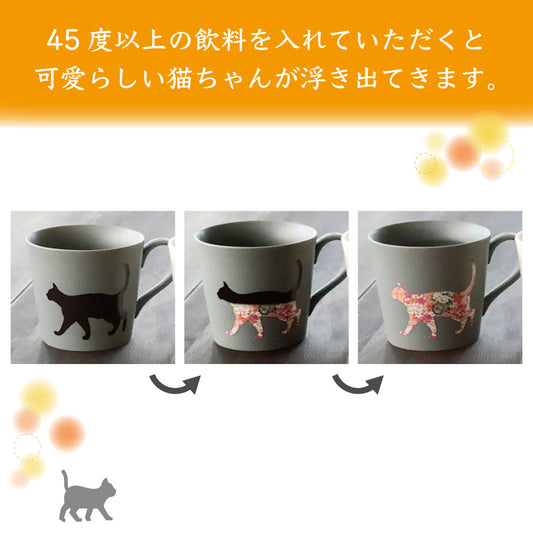 丸モ高木陶器 温感マグカップ 捜す猫 マットライトグレー 猫 猫柄 マグカップ マグ 猫モチーフ 陶器 ネコ 食器 温度で変化 色が変わる 猫グッズ 日本製
