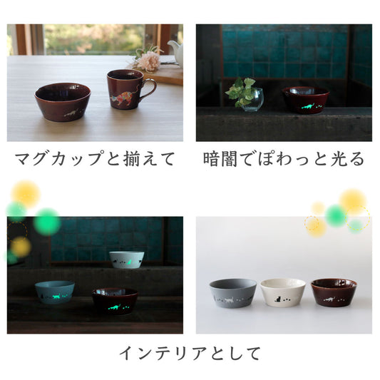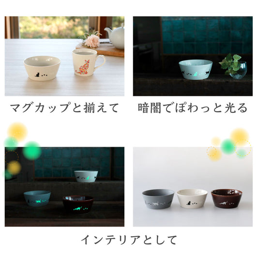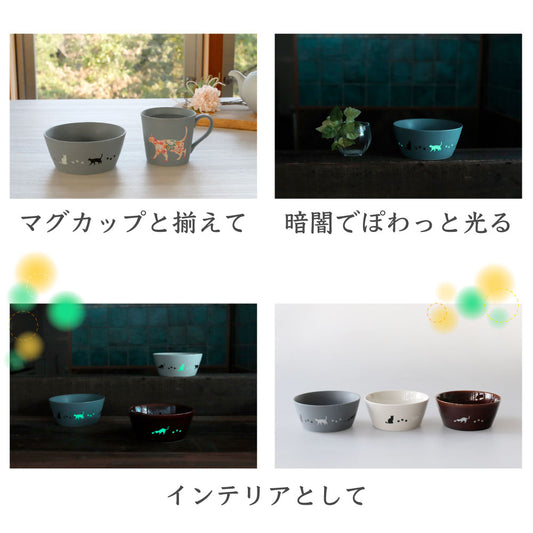 丸モ高木陶器 蓄光 猫 13cm ルミナスボウル マットライトグレー 猫 猫柄 皿 ボウル 猫モチーフ 陶器 ネコ 食器 温度で変化 色が変わる 猫グッズ 日本製