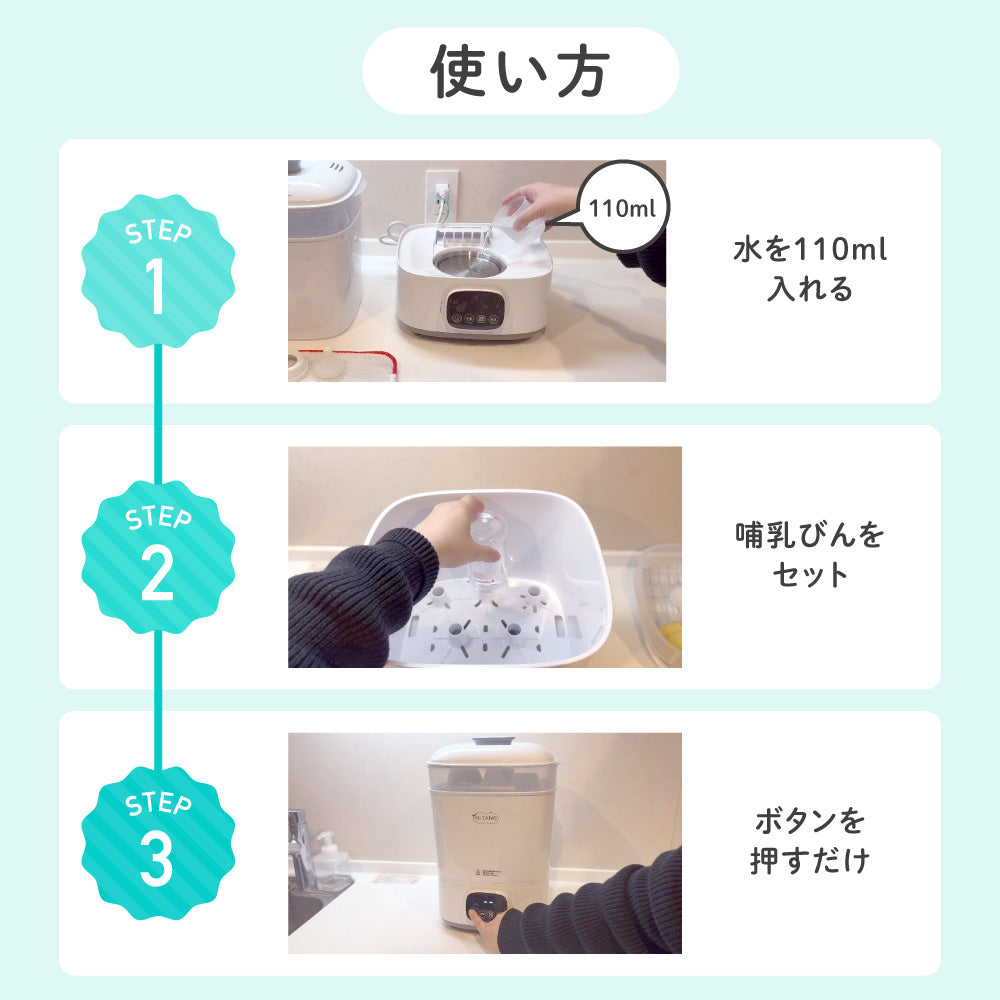 【IKUTANO 哺乳びん スチーム除菌 乾燥器】は、育児中のあなたの強い味方。ボタンひとつで簡単にスチーム除菌~乾燥までしてくれるのですぐに使え、育児の負担を軽減してくれます。