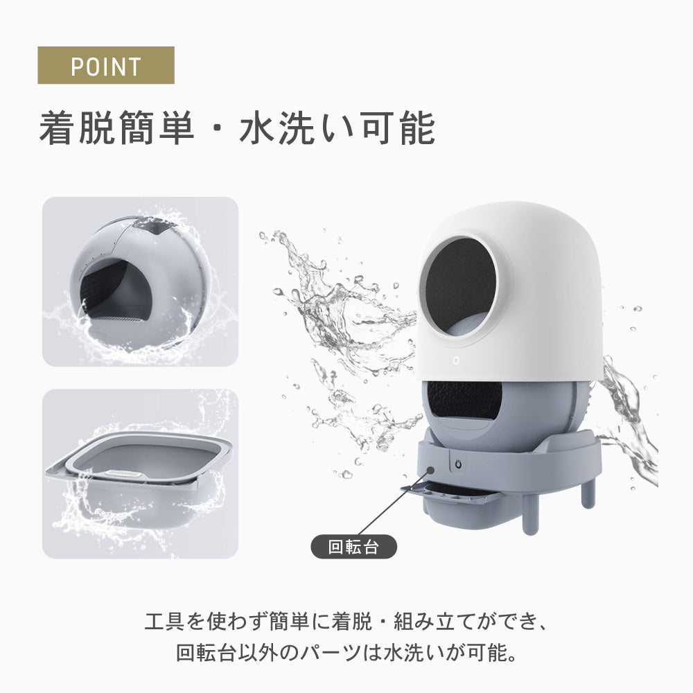 内蔵のPIRモーション(赤外線)センサーが猫の体温を感知し、トイレの外に出た後にドームが自動で回転。スマートに排泄物の処理を行います。